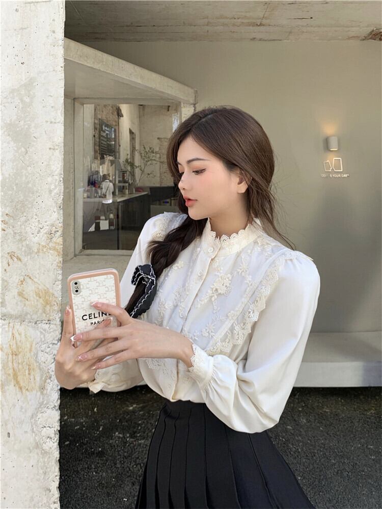 シャツ 長袖 刺繍 スタンドカラー 大人気 レトロ レディース プリンセススタイル