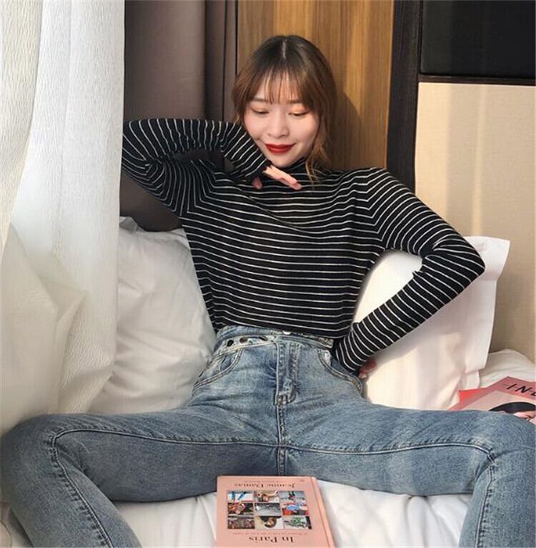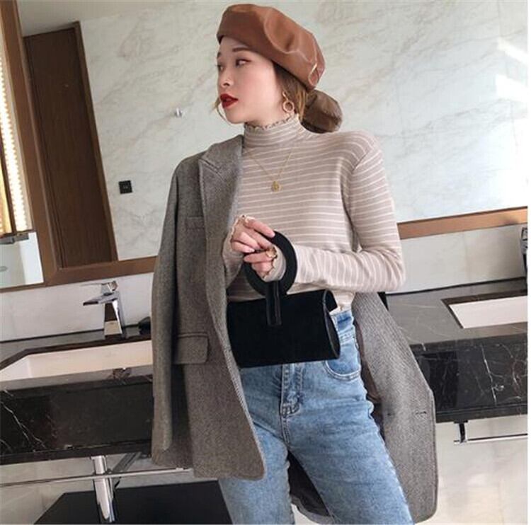 短いスタイル ボーダー 長袖 ニットトップス タートルネック レディース レトロ 暖かい 厚手