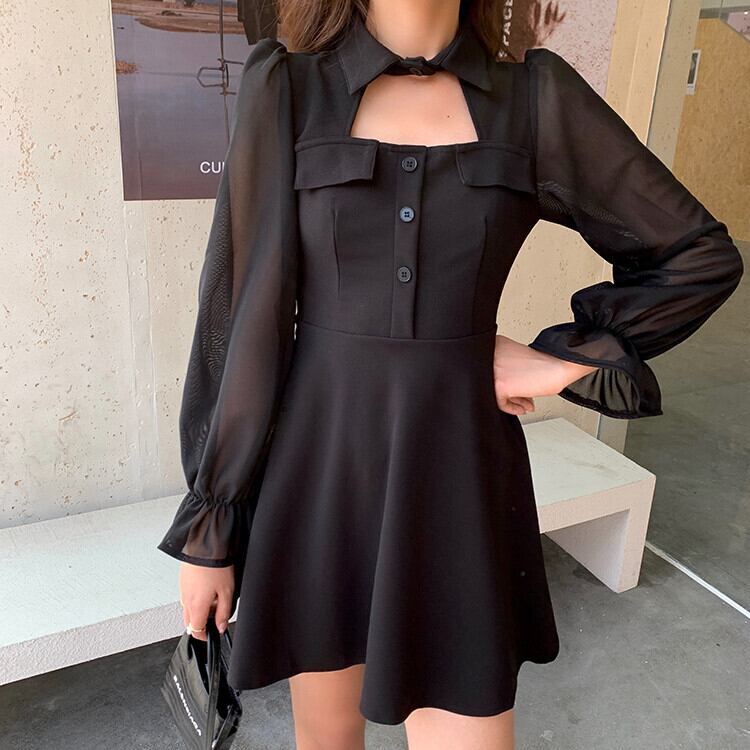 ワンピース ウエスト スリム ホロー ガーゼスリーブ 長袖
