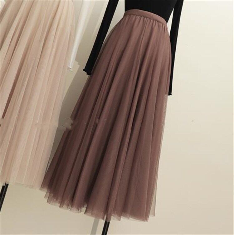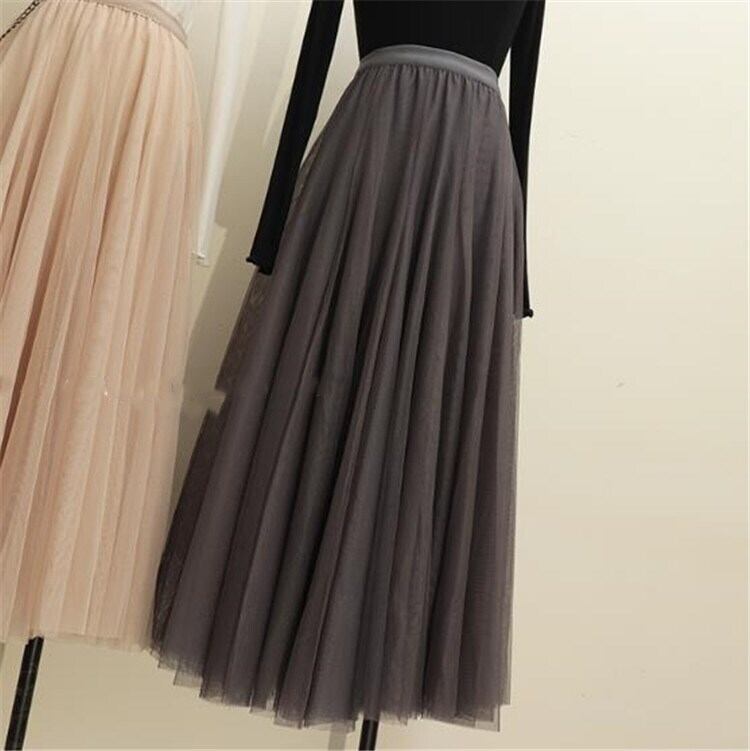 韓国ファッション 上品映え チュールスカート ふくらんでいるスカート ハイウエスト スリムフィット Aライン 大きい裾 中・長セクション プリーツスカート