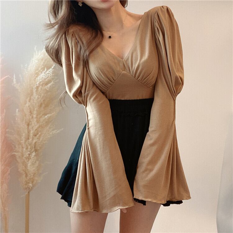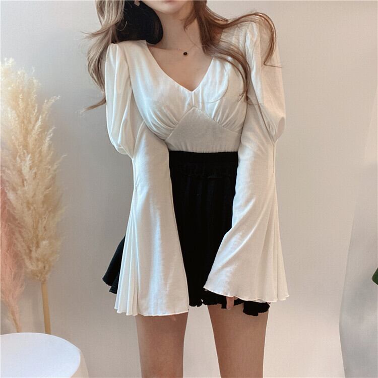 Vネック スリムフィット ホーンスリーブ Tシャツ トップス 百掛け エレガント デザインセンス